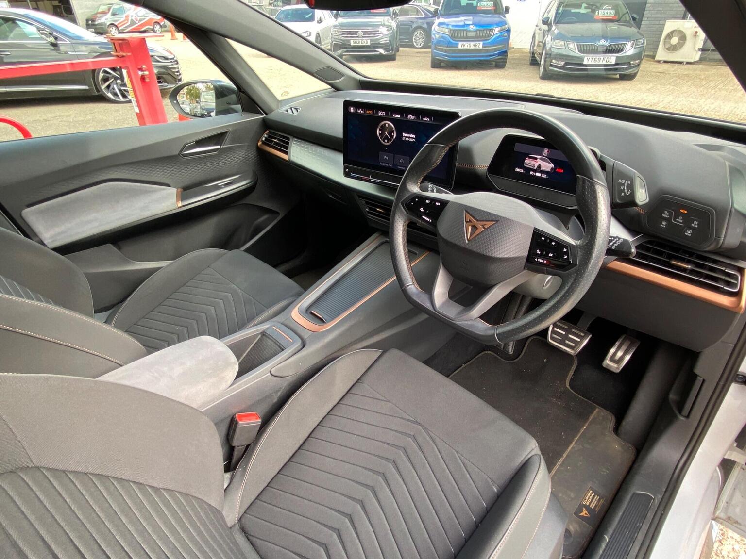 11 kW AC Charging Capacity, 120kW DC Charging Capacity, 19in Alloy Wheels - Machined Typhoon, 3-Point Seatbelts, 5 Infotainment Speakers, 5.3in Digital Cockpit with 12in Central Display Infotainment System, Aluminium Pedals, Anti-Theft Alarm System - Interior Monitoring - Backup Horn and Towing Protection, Augmented Reality Head-Up Display, Auto Dimming Rear View Mirror, Bluetooth, CUPRA Connect, CUPRA Emblem on Steering Wheel, Charging Cable - Mode 3 - 16amp, Climatronic Dual-Zone Air Conditioning, DAB and AM/FM Radio, Dark Tinted Rear Windows, Door Mirrors Electrically Adjustable - Folding and Heated, Driver Alert System, Driver and Front Passenger Airbags with Front Passenger Airbag Deactivation, Drivers and Passenger Seats - Manual Height Adjustment, Driving Profile Selection, Dynamic Steering, Electric Auxiliary Air Heater, Emergency Steering Support with Turn Assist, Emergency Tyre Repair Kit, Extended Safety System, Forward Collision Warning with Automatic Braking, Front Side Curtain Airbag, Full LED Headlights with Welcome Home Function and Adverse Weather Function, Grey Exterior Mirrors, Heat-insulated Glass and Acoustic Windshield, Heated - Leather-Wrapped - Multifunction Steering Wheel, Heated Front Seats, Heated Washer Nozzles, ISOFIX Points in Outer Rear Seats with Top Tether Anchorage Points, Illuminated Sunvisor with Mirror, Interaction Airbag in Front, Keyless-Go Central Locking System, LED Rear Lights, Lane Assist, Locking Wheel Bolts with Anti-theft Protection, Multi-Coloured Interior Ambient Lighting, Park Assist - including Front and Rear Sensors, Pilot - M, Shock Absorption in Front, Sports Rear Shock Absorption, Tool Kit, Transport Protection Film, Tyre Pressure Monitoring System, USB Type C x4 - x2 Front and x2 Rear, Unsplit Rear Seat Bench - Split Folding Backrest, Visual and Acoustic Seatbelt Reminder, Voice Assistant, Windshield Wiper with Light-Rain Sensor, Wireless Full Link Smartphone Integration, e-Call Service